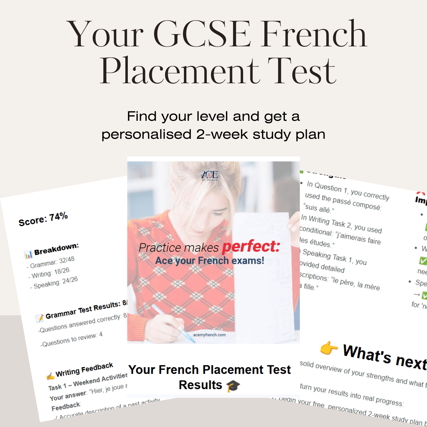 In just 15 minutes, this smart online test identifies their current level and provides a personalised 2-week study plan created by a GCSE French tutor.