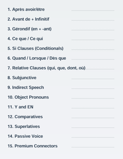 The French Examiner Method breaks down 15 high-impact grammar structures that help students turn simple answers into more advanced, exam-ready responses — quickly and confidently.